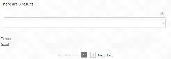 Of course, a page with just search results is not very user friendly so we add some more components. Let's add the "Results Count" on top, a dropdown "Filter" as well and the "Page Selector" at the bottom. We will go for a fixed page size, and have set it's value in the Search Results component. We now have something like this: